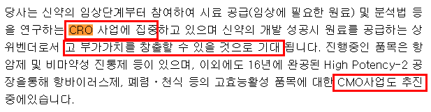 추진중에 있다는 말이 나와있는데, CMO에 대한 언급에 비해 CRO에 대한 사항은 위 캡쳐자료밖에 언급이 되어 있지 않다.