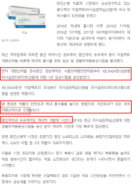 파킨슨병의 대표 치료제약인 '아질렉트(라사길린메실산염)'의 개량신약에 도전하는 국내 업체로, 경보,명인, 유유제약이 나온다. 여기서 명인,유유제약은 아질렉트의 복제약 개발이고,