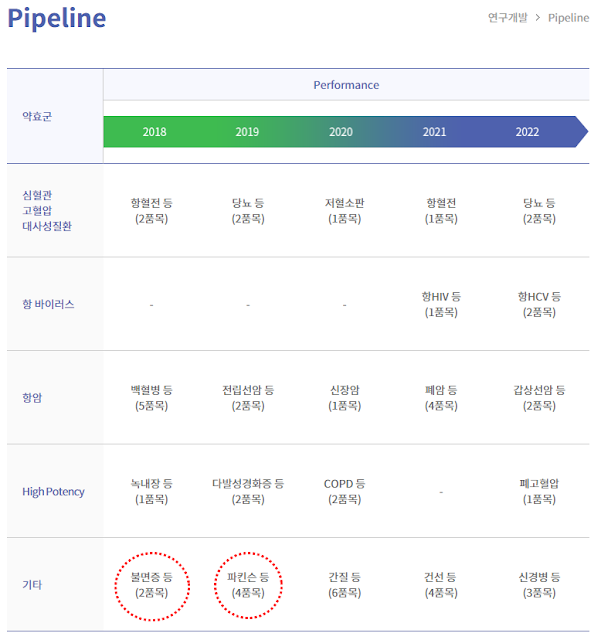위 캡쳐자료는 '경보제약'홈페이지에서 뽑아왔는데, 경보제약의 향후 파이프라인이 될 제품군이라고 한다. 여기서 2018년, 2019년 '파킨슨'과 '불면증' 등 정신질환에 동그라미 표시를 하였는데, 2022년을 찾아보자.