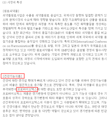 사업보고서 '시장의 특성'부분을 보면 앞에 [원료의약품]이 나오고, 두번째 [건강기능식품]이 나온다. 그리고 그 단락안의 내용을 보면 '프로바이오틱스'라는 사항이 가장 눈에 띈다.