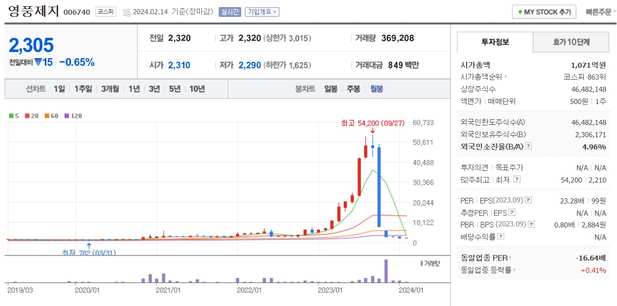 제작년 10월 3,000원대였던 영풍제지는 1년 뒤 48,000 원대로 약 14배 뛰었습니다.