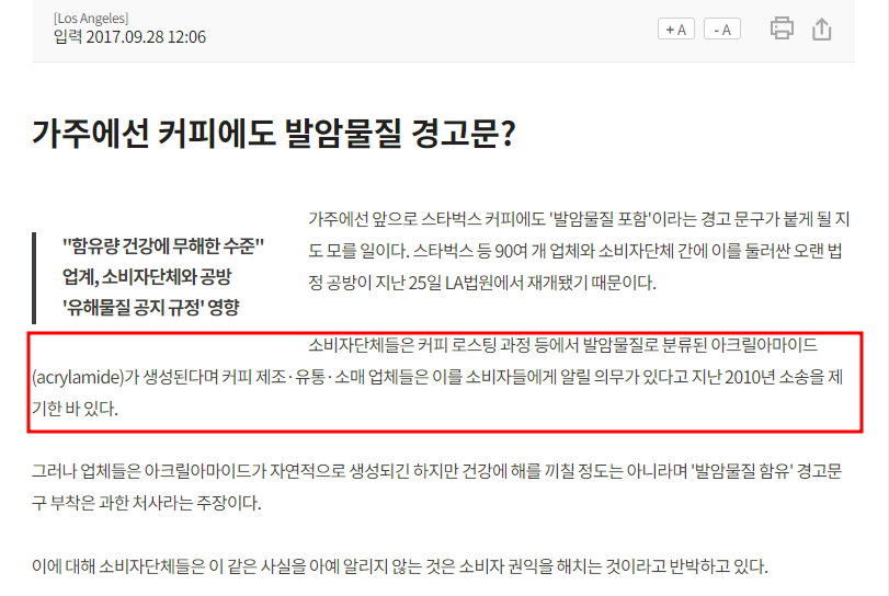가주에선 커피에도 발암물질 경고문?