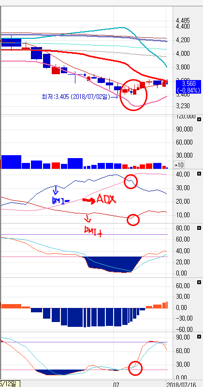내가 여기서 말하고자하는 지표는, 마우스로 힘겹게(?) 표시한 DMI+, DMI- 지표와, ADX 이다.