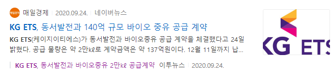 이런 상황에서 KG ETS가 보여준 동서발전과의 140억 바이오중유 공급계약은