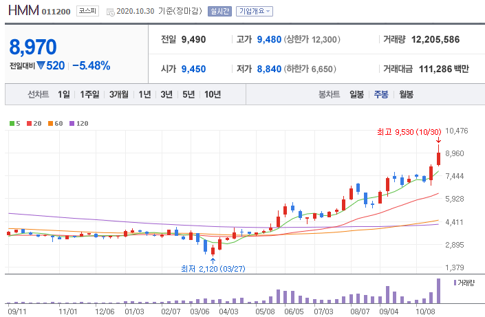 요즘 HMM (옛 현대상선) 주가가 한창 오르는 것을 보니,